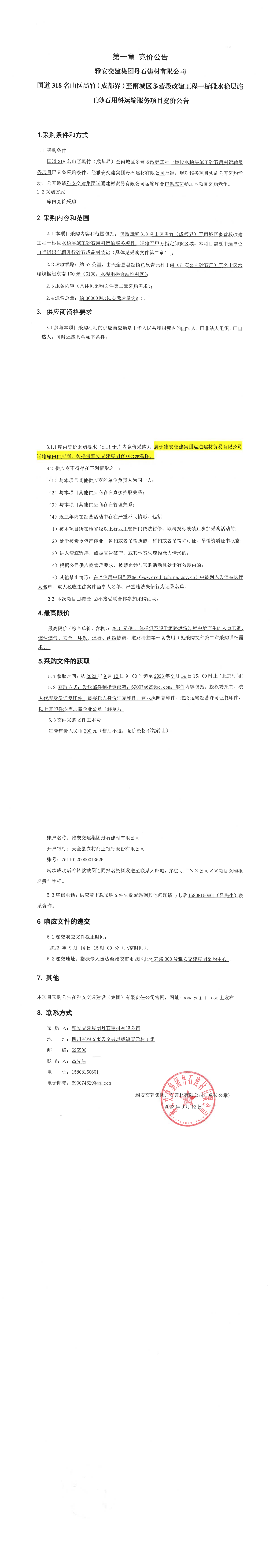 DB视讯 集团丹石建材有限公司国道318名山区黑竹(成都界)至雨城区多营段改建工程一标段水稳层施工砂石用料运输服务项目竞价公告