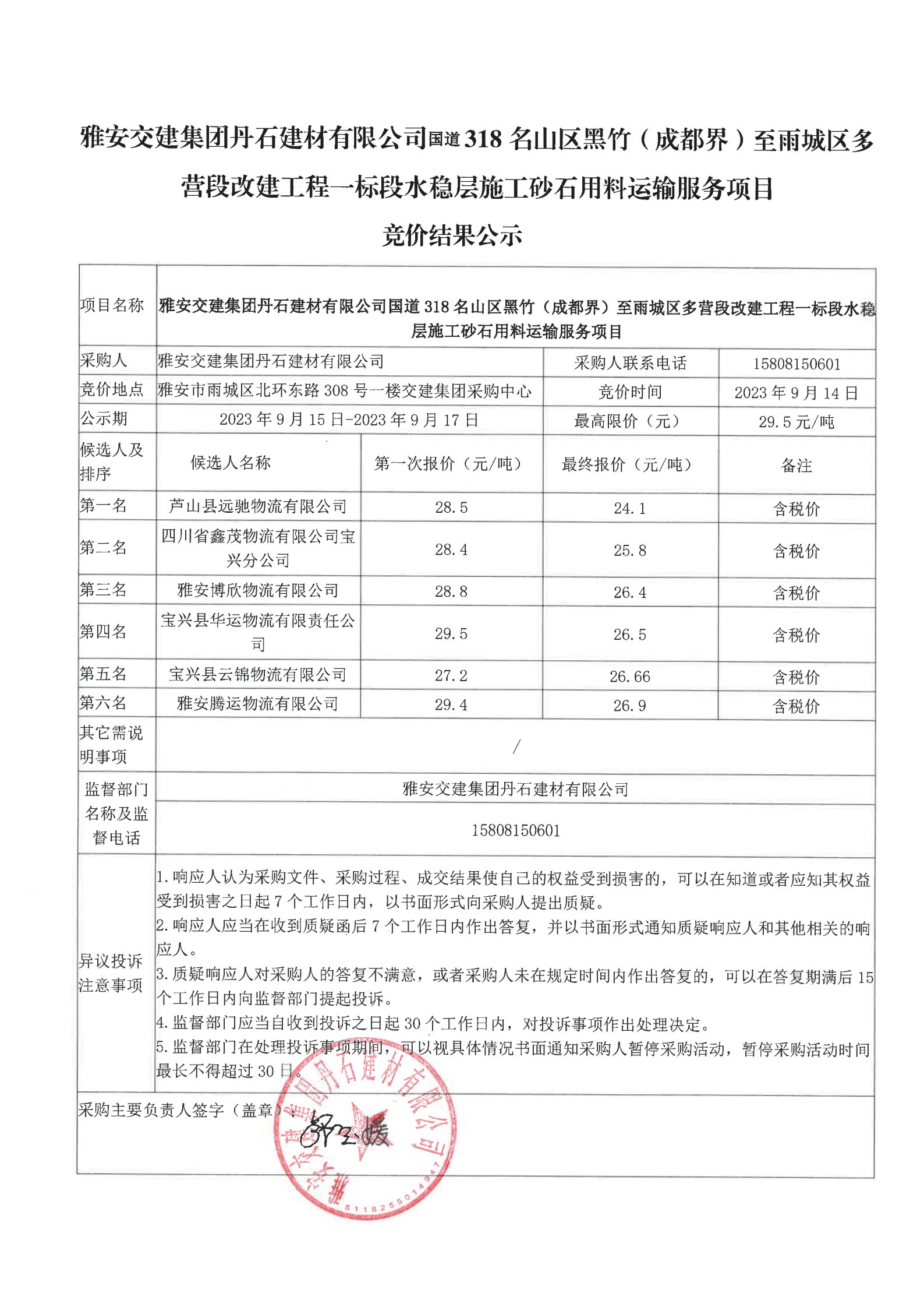 DB视讯 集团丹石建材有限公司国道318名山区黑竹(成都界)至雨城区多营段改建工程一标段水稳层施工砂石用料运输服务项目竞价结果公示
