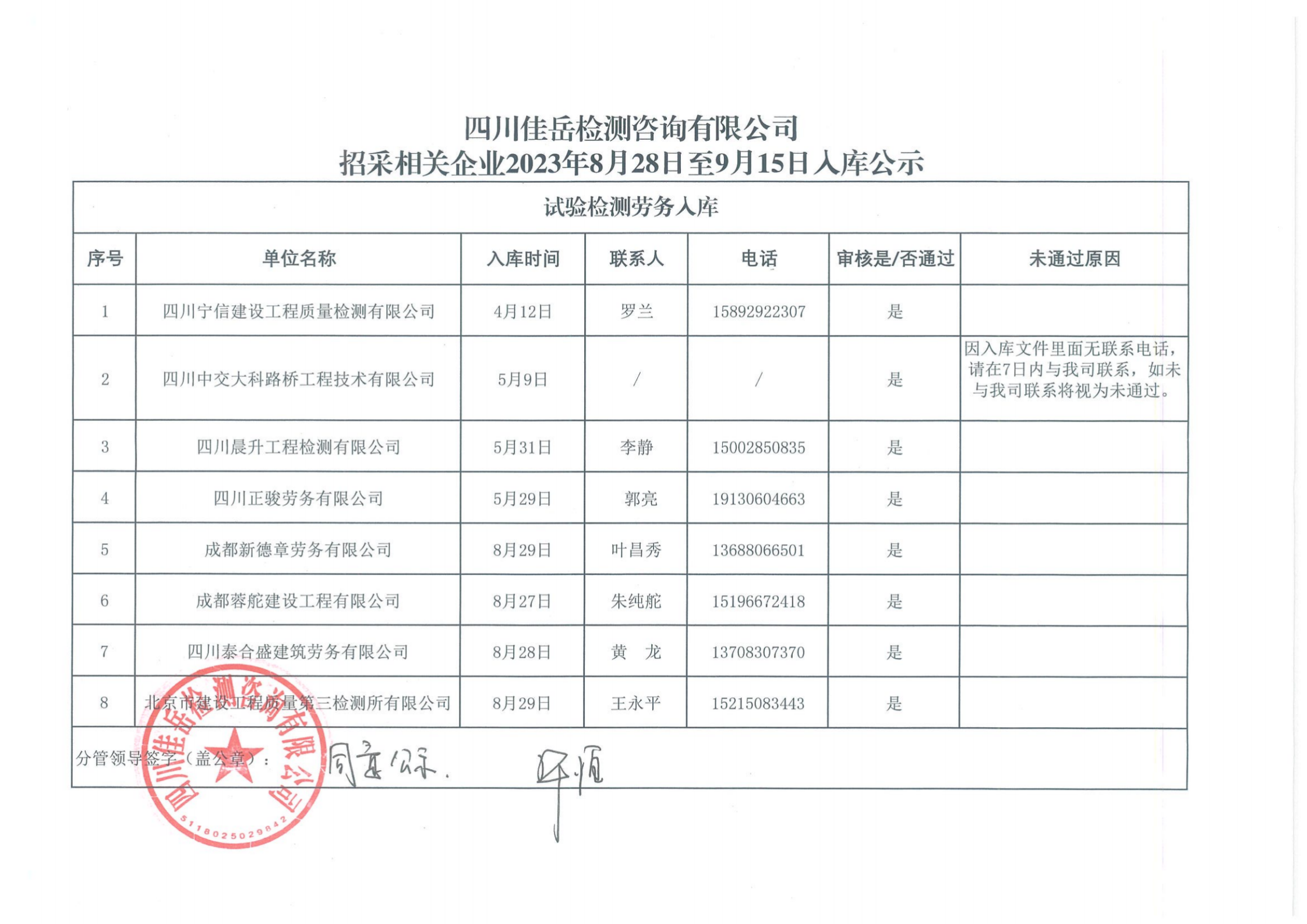 四川佳岳检测咨询有限公司招采相关企业2023年8月28日至9月15日入库结果公示