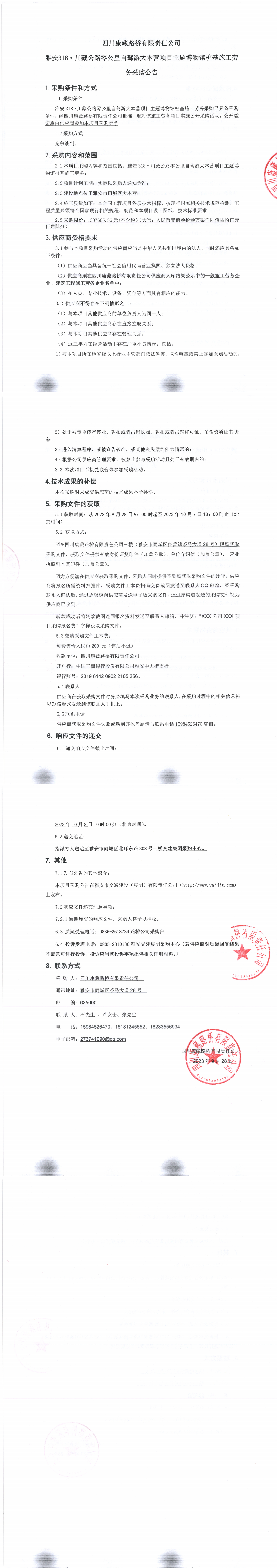 四川康藏路桥有限责任公司雅安318·川藏公路零公里自驾游大本营项目主题博物馆桩基施工劳务采购公告