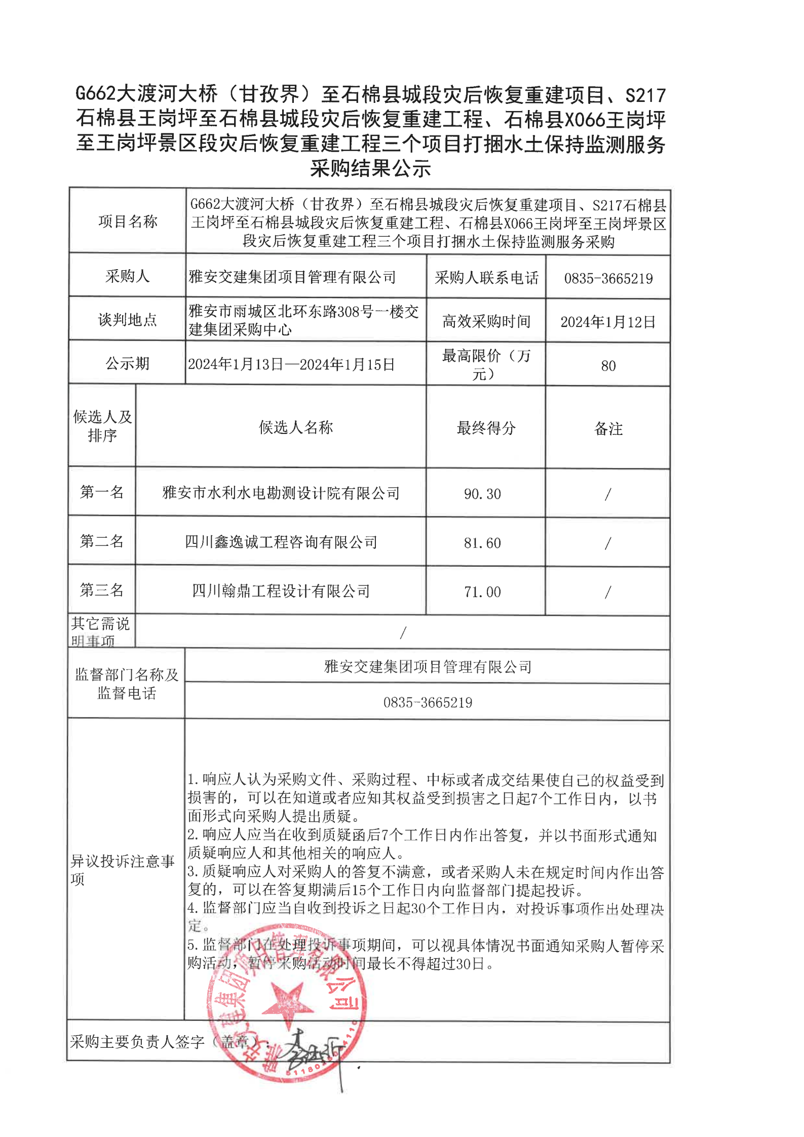 DB视讯 集团项目管理有限公司G662大渡河大桥(甘孜界)至石棉县城段灾后恢复重建项目、S217石棉县王岗坪至石棉县城段灾后恢复重建工程、石棉县X066王岗坪至王岗坪景区段灾后恢复重建工程三个项目打捆水土保持监测服务采购结果公示