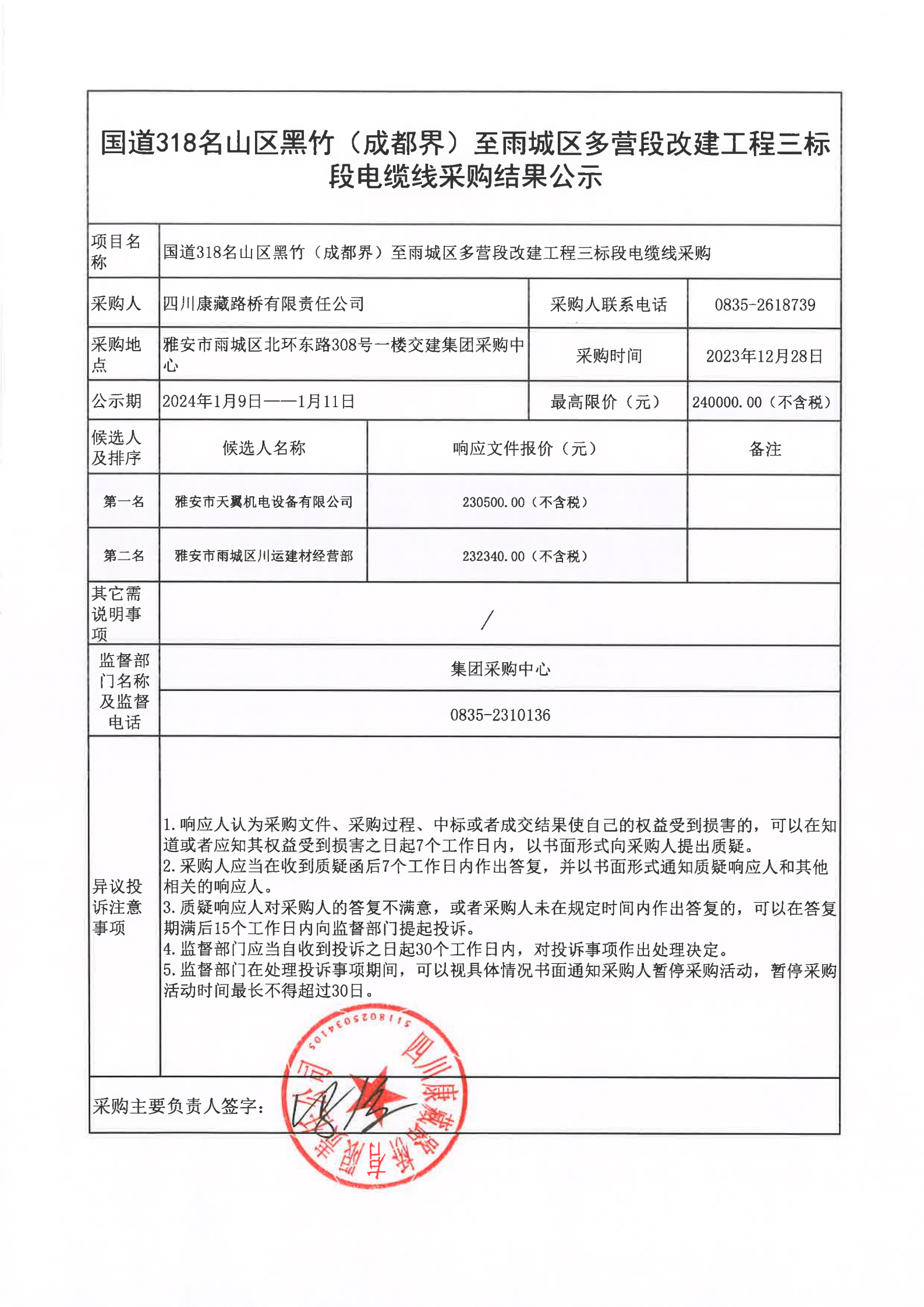 四川康藏路桥有限责任公司国道318名山区黑竹(成都界)至雨城区多营段改建工程三标段电缆线采购结果公示