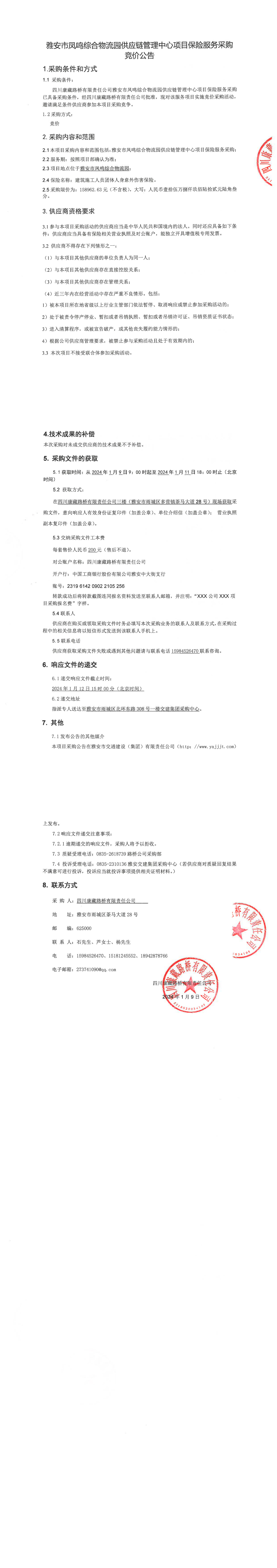 四川康藏路桥有限责任公司雅安凤鸣综合物流园供应链管理中心项目保险服务采购竞价公告