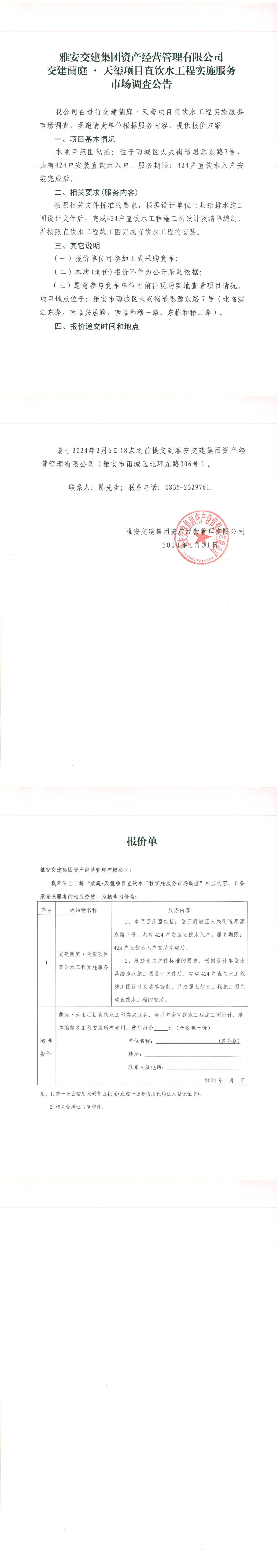 DB视讯 集团资产经营管理有限公司交建蘭庭·天玺项目直饮水工程实施服务市场调查公告