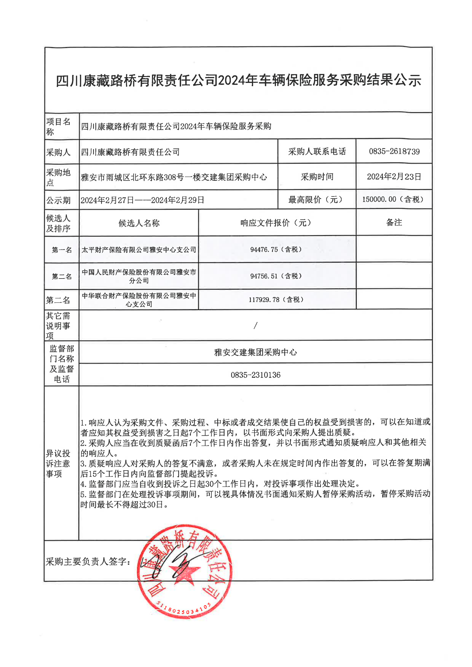 四川康藏路桥有限责任公司2024年车辆保险服务采购结果公示