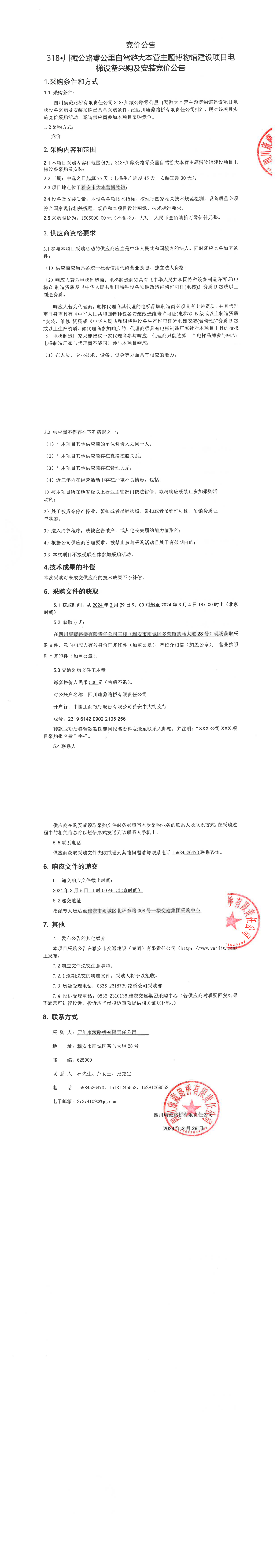 四川康藏路桥有限责任公司318·川藏公路零公里自驾游大本营主题博物馆建设项目电梯设备采购及安装竞价公告