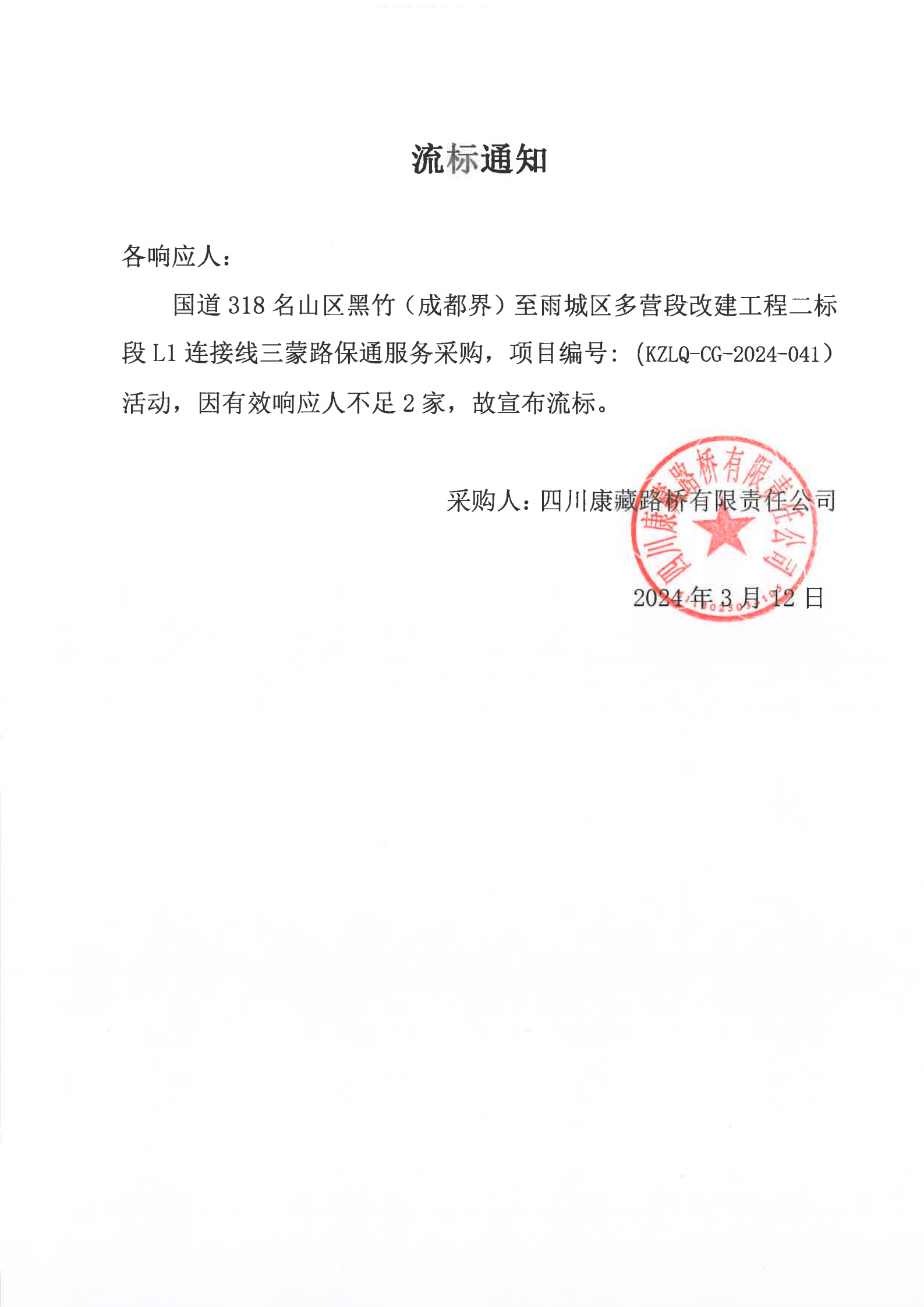 四川康藏路桥有限责任公司国道318名山区黑竹(成都界)至雨城区多营段改建工程二标段L1连接线三蒙路保通服务采购流标通知