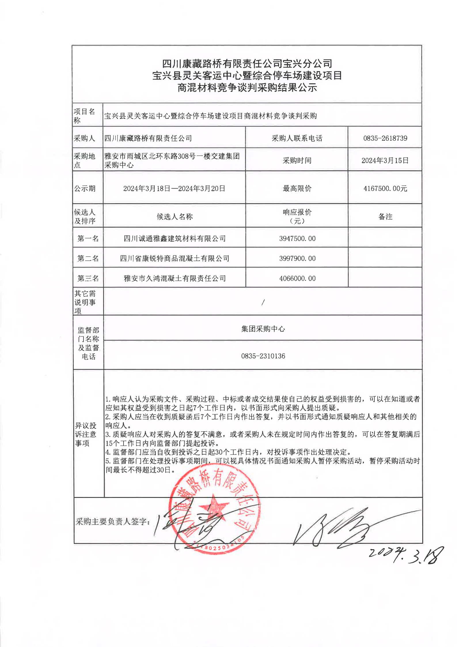 四川康藏路桥有限责任公司宝兴分公司宝兴县灵关客运中心暨综合停车场建设项目商混材料竞争谈判采购结果公示