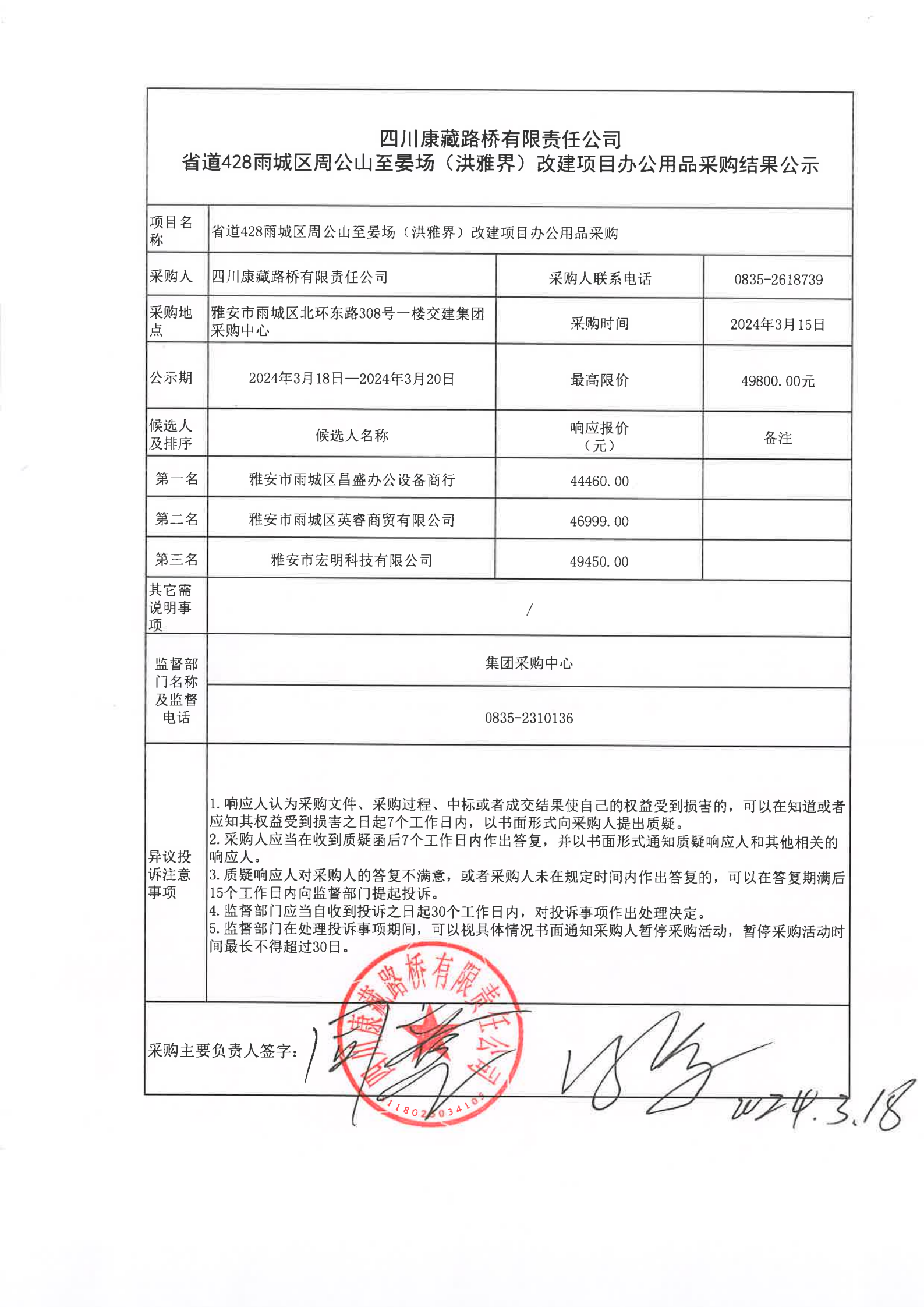 四川康藏路桥有限责任公司省道428雨城区周公山至晏场(洪雅界)改建项目办公用品(第二次)采购结果公示