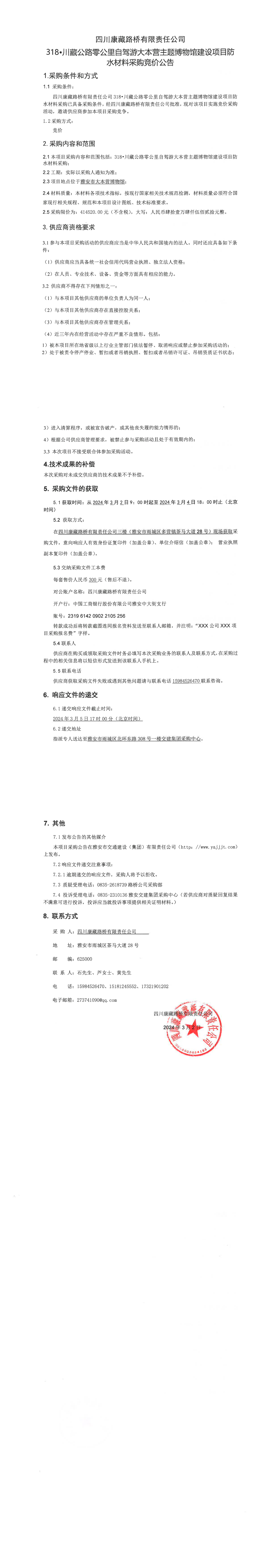 四川康藏路桥有限责任公司318·川藏公路零公里自驾游大本营主题博物馆建设项目防水材料采购竞价公告