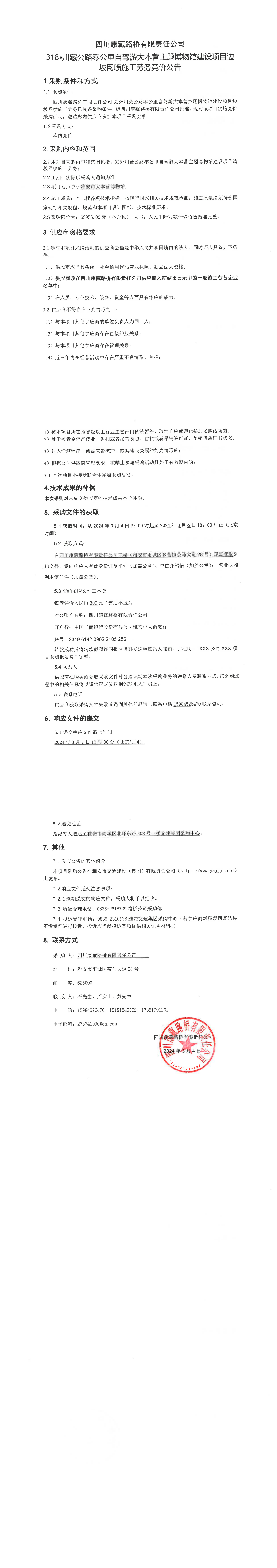 四川康藏路桥有限责任公司318·川藏公路零公里自驾游大本营主题博物馆建设项目边坡网喷施工劳务竞价公告