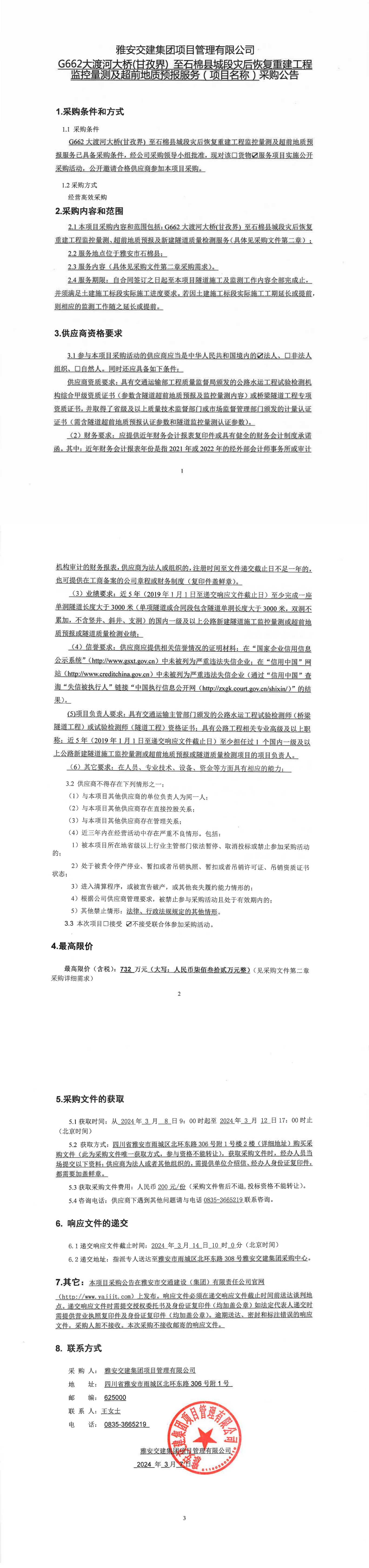 DB视讯 集团项目管理有限公司G662大渡河大桥(甘孜界)至石棉县城段灾后恢复重建工程监控量测及超前地质预报服务(项目名称)采购公告