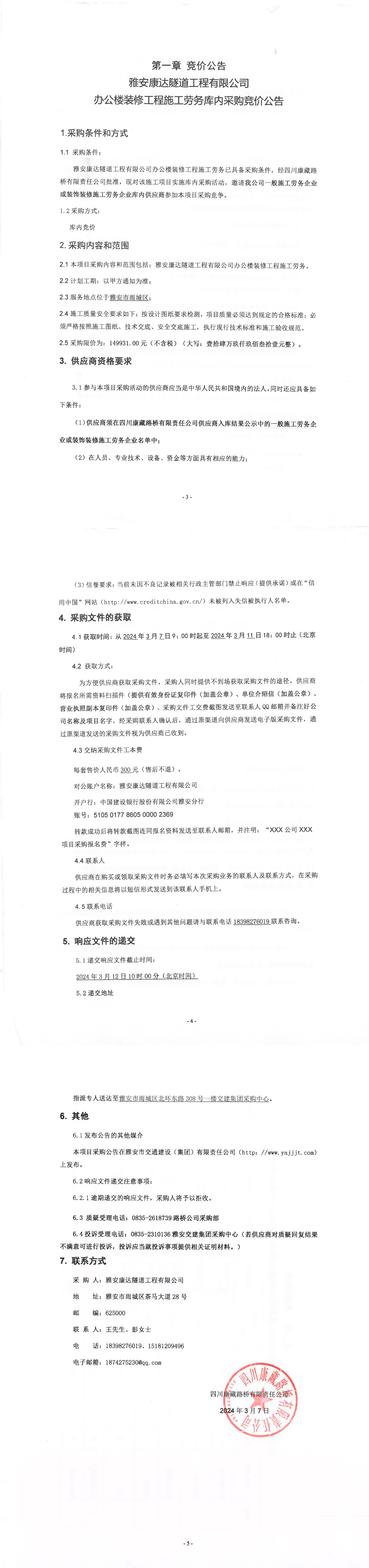 雅安康达隧道工程有限公司办公楼装修工程施工劳务库内采购竞价公告