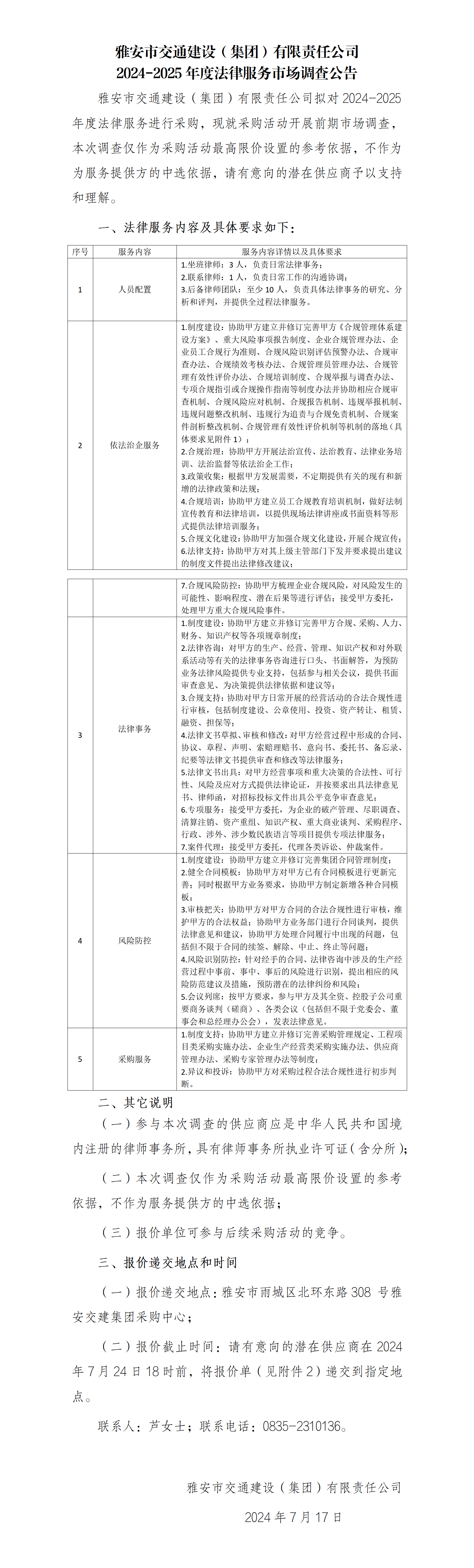 雅安市交通建设(集团)有限责任公司2024-2025年度法律服务市场调查公告