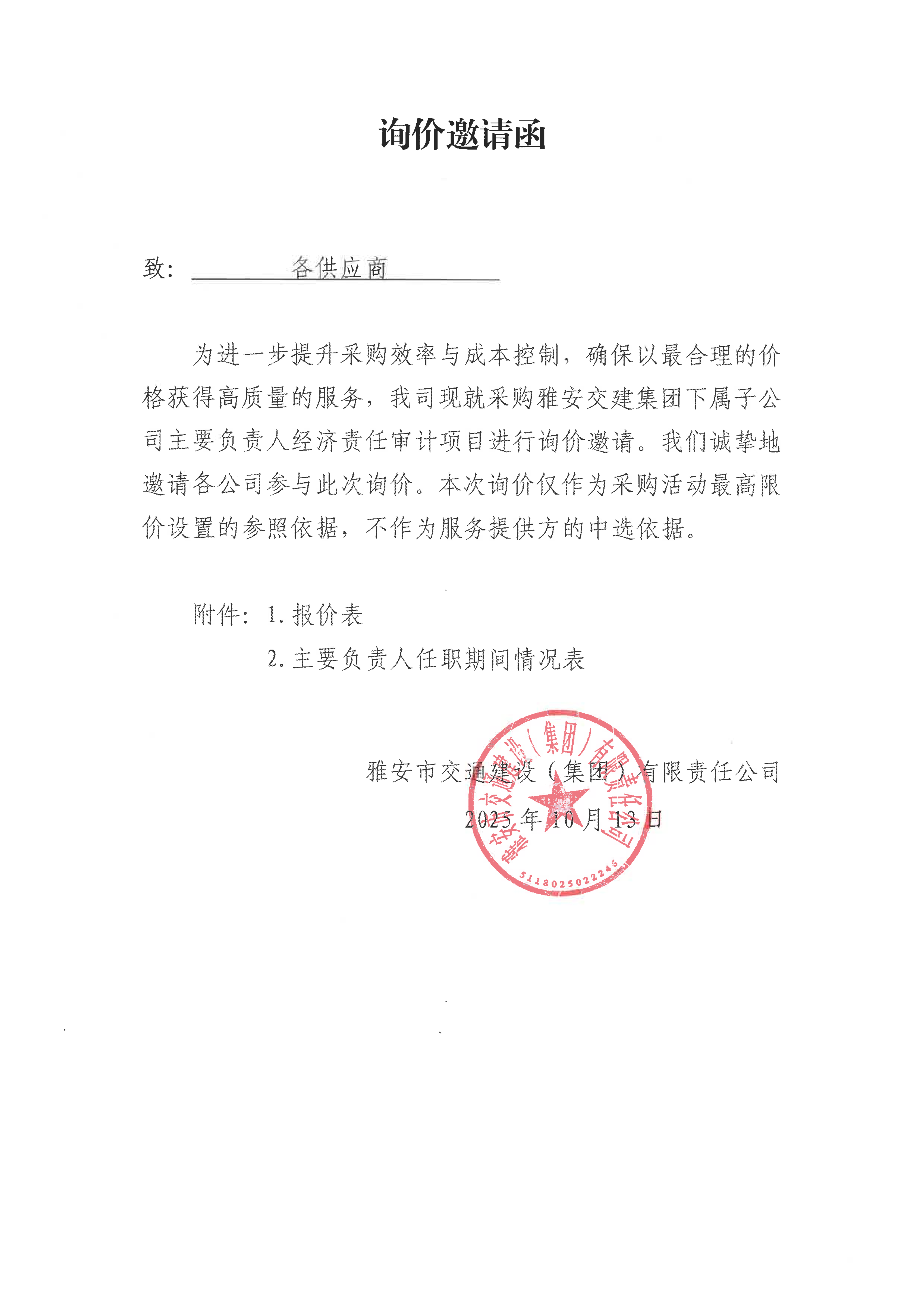 关于雅安市交通建设(集团)有限责任公司常年法律顾问服务的询价函