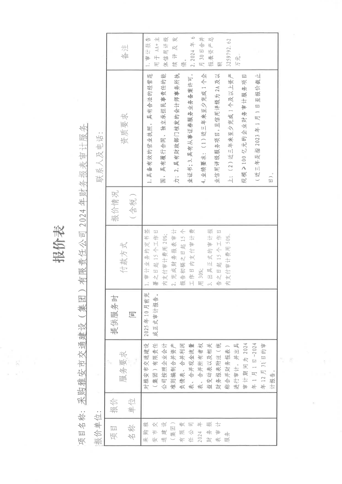 关于采购雅安市交通建设(集团)有限责任公司主体信用评级2024年财务报表审计服务单位的询价函