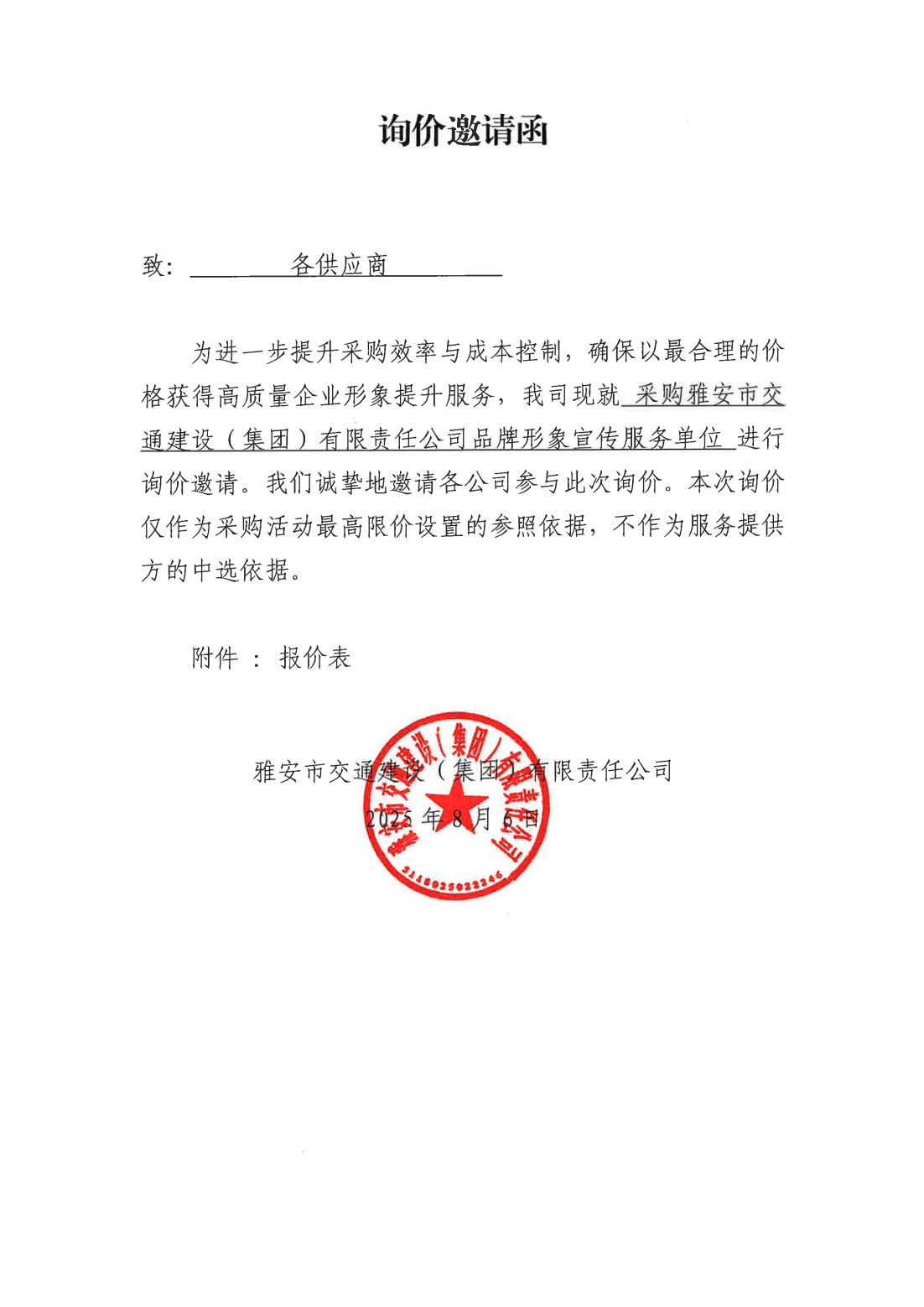 关于采购集团品牌形象宣传服务单位的询价函