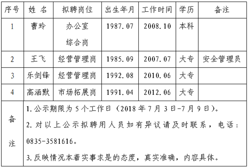 顺利获得公开报名、资格审查、面试等程序,经公司研究确定以下4名拟聘用人员,现公示名单如下: