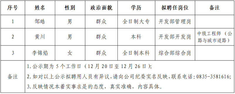 3名拟聘用人员予以公示: