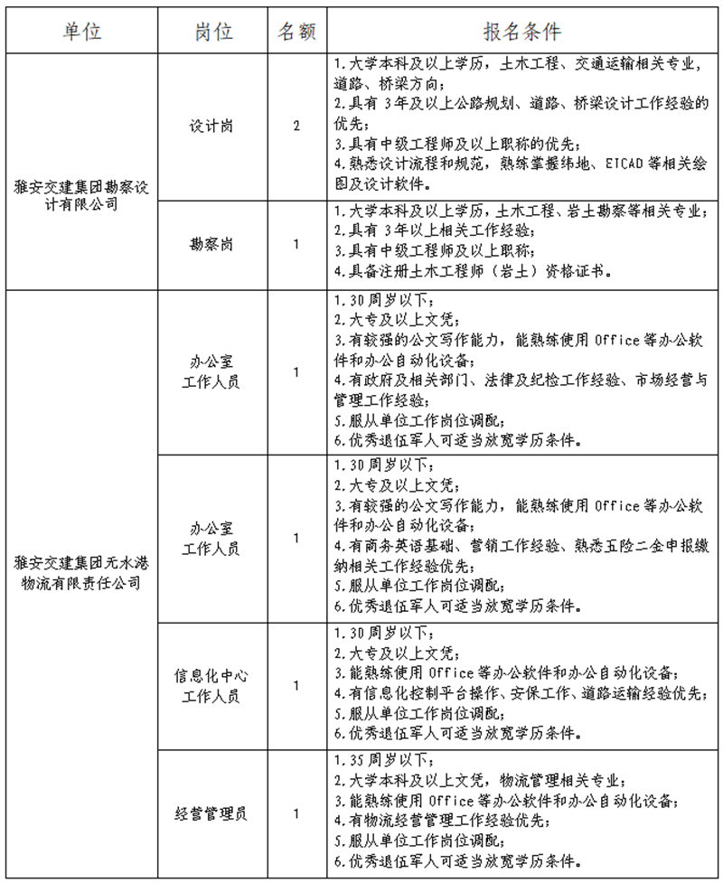 根据开展需要,决定面向社会公开招聘雅安市交通建设(集团)有限责任公司(以下简称“DB视讯 集团”)所属子公司工作人员7名,现将有关事项公告如下: