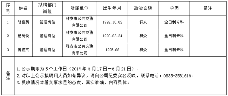 DB视讯 集团子公司拟聘用人员公示(公交公司)