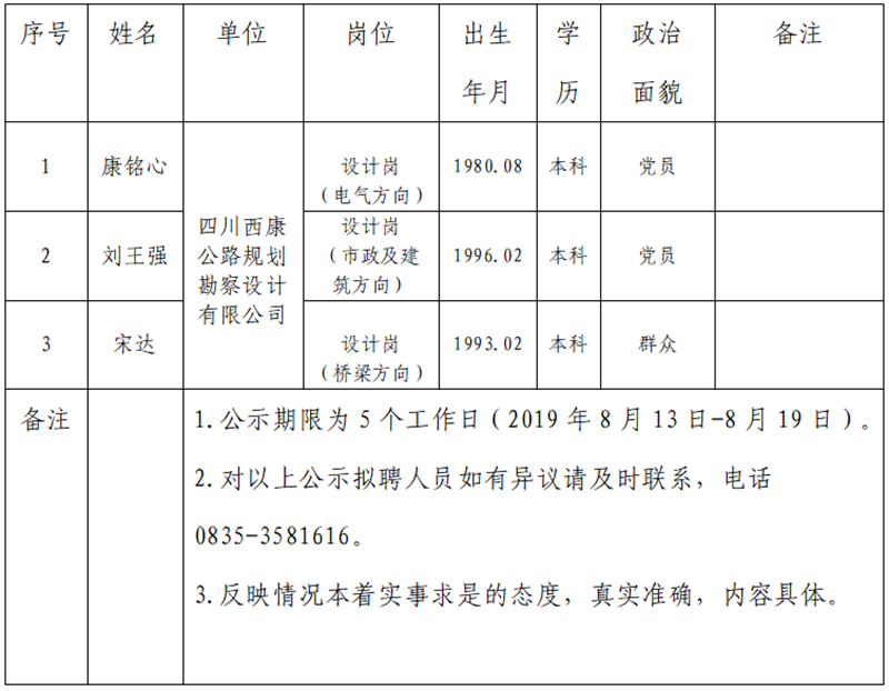 根据集团公司《人才选聘实施办法》,经研究,对以下拟聘用人员予以公示: