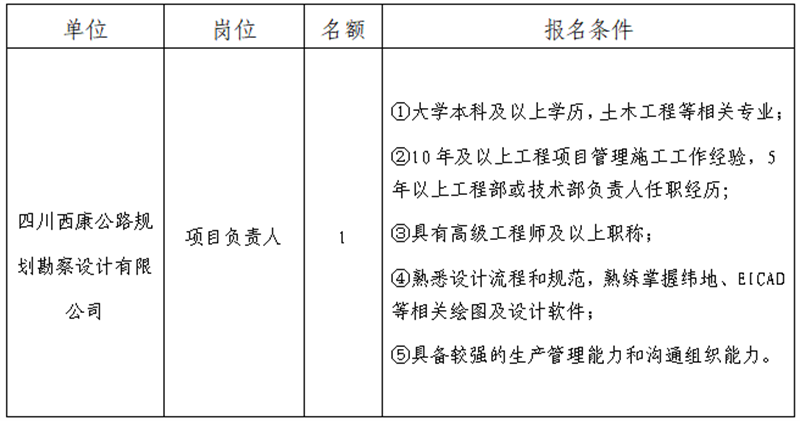 根据开展需要,决定面向社会公开招聘雅安市交通建设(集团)有限责任公司(以下简称“DB视讯 集团”)所属子公司项目负责人1名,现将有关事项公告如下:
