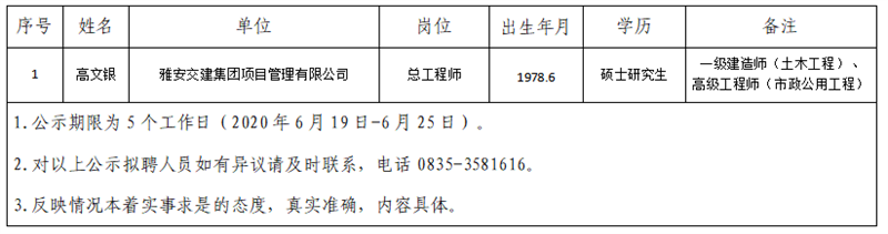 雅安市交通建设(集团)有限责任公司拟聘用人员公示(项目管理公司人才引进)