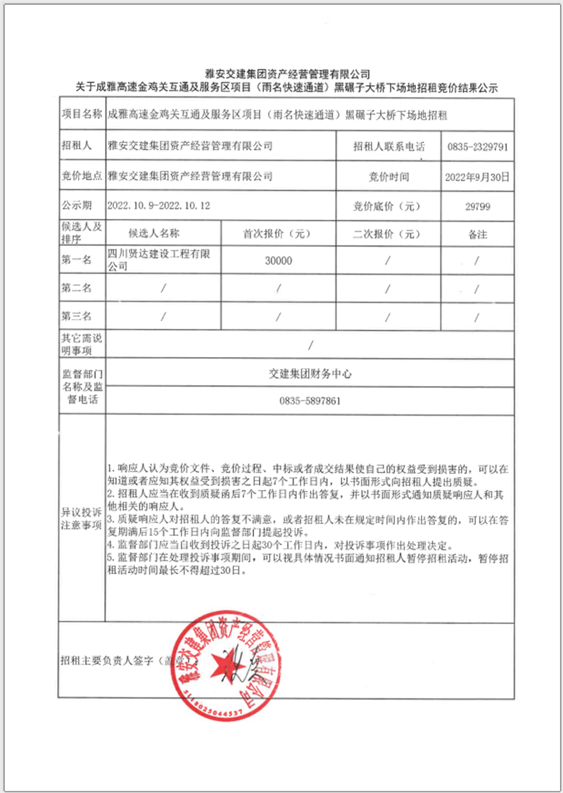 关于成雅高速金鸡关互通及服务区项目(雨名快速通道)黑碾子大桥下场地招租竞价结果公示