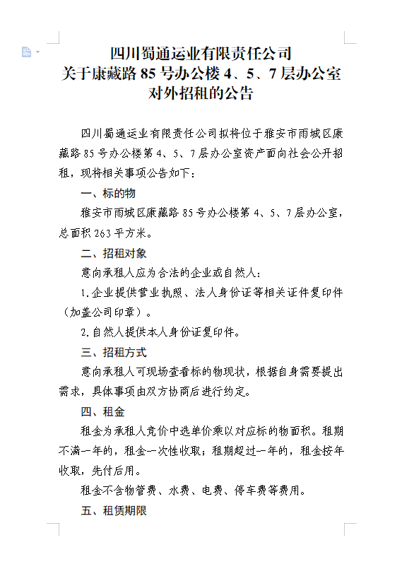四川蜀通运业有限责任公司关于康藏路85号办公楼4、5、7楼资产租赁公告