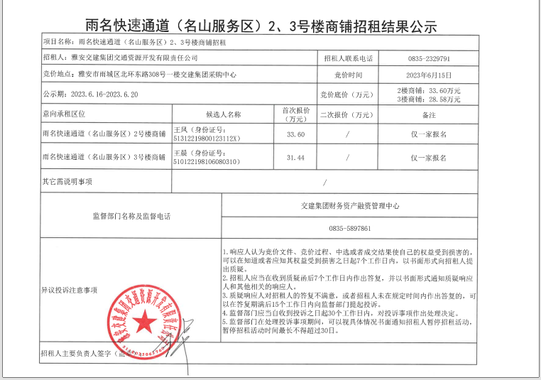 交通资源开发公司雨名快速通道(名山服务区)2、3号楼商铺招租结果公示