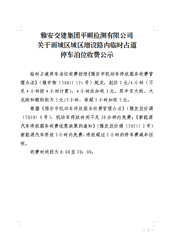 DB视讯 集团平顺检测有限公司关于雨城区城区增设路内临时占道停车泊位收费公示