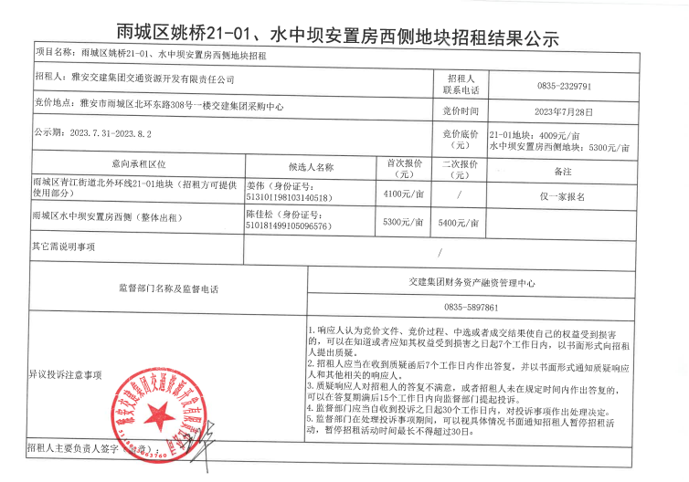 DB视讯 集团交通资源开发有限责任公司关于雅安市雨城区姚桥21-01和水中坝块块招租结果公示