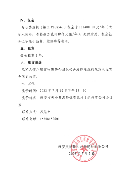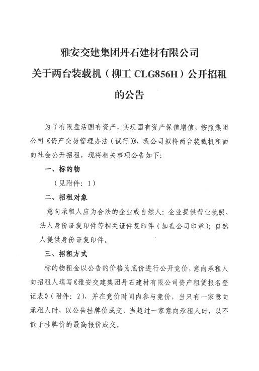 DB视讯 集团丹石建材有限公司关于2台装载机公开招租的公告附件