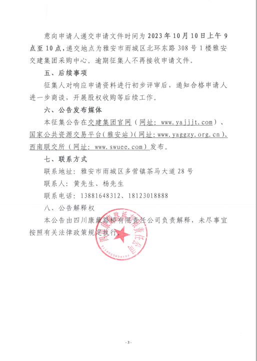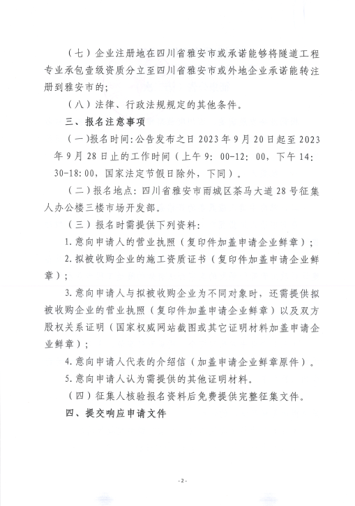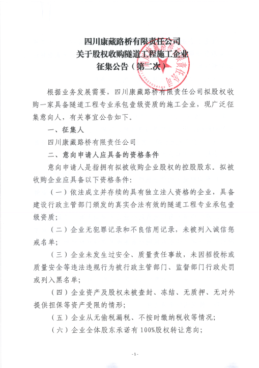 四川康藏路桥有限责任公司关于股权收购隧道工程施工企业征集公告(第二次)