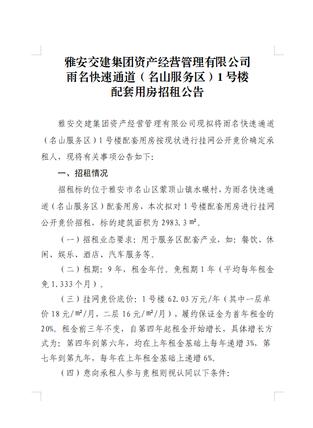 DB视讯 集团资产经营管理有限公司雨名快速通道(名山服务区)1号楼配套用房招租公告
