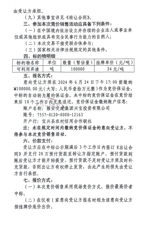 DB视讯 集团兴宝投资有限公司宝兴县灵关镇代碑寺土地整理项目10万吨可利用弃渣竞价销售公告(2024.6.21)