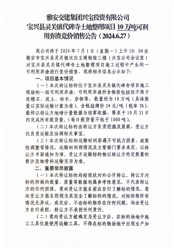 DB视讯 集团兴宝投资有限公司宝兴县灵关镇代碑寺土地整理项目10万吨可利用弃渣竞价销售公告(2024.6.27)