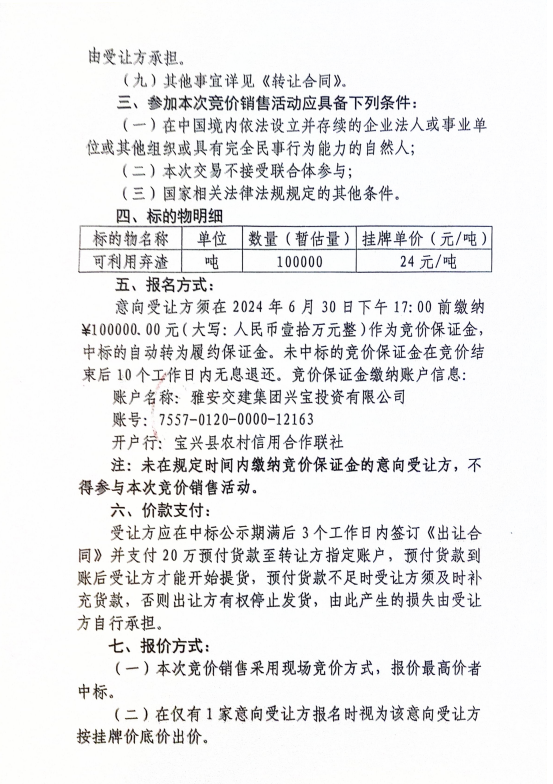 DB视讯 集团兴宝投资有限公司宝兴县灵关镇代碑寺土地整理项目10万吨可利用弃渣竞价销售公告(2024.6.21)