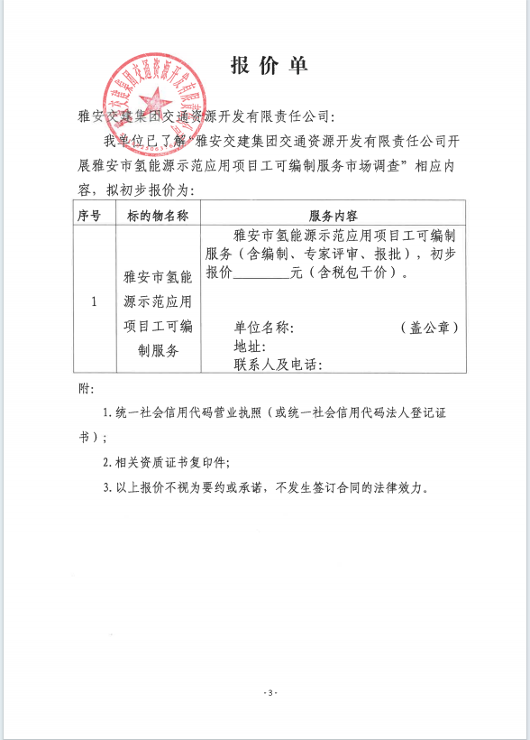 DB视讯 集团交通资源开发有限责任公司雅安市氢能源示范应用项目工可编制服务市场调查公告