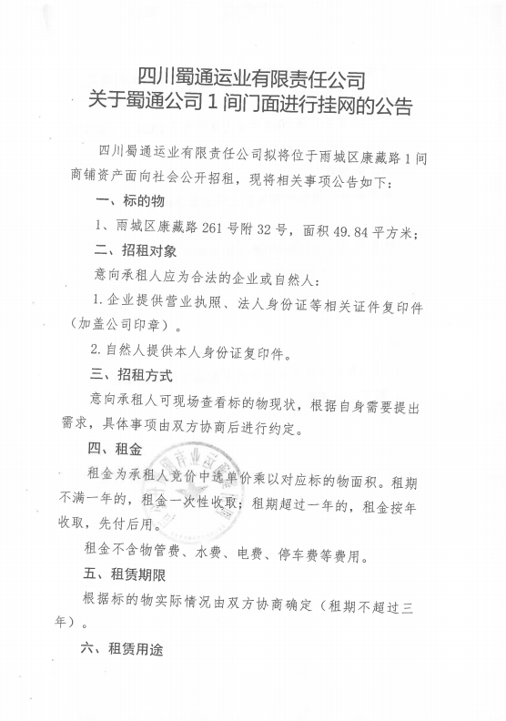 四川蜀通运业有限责任公司关于蜀通公司1间门面进行挂网的公告