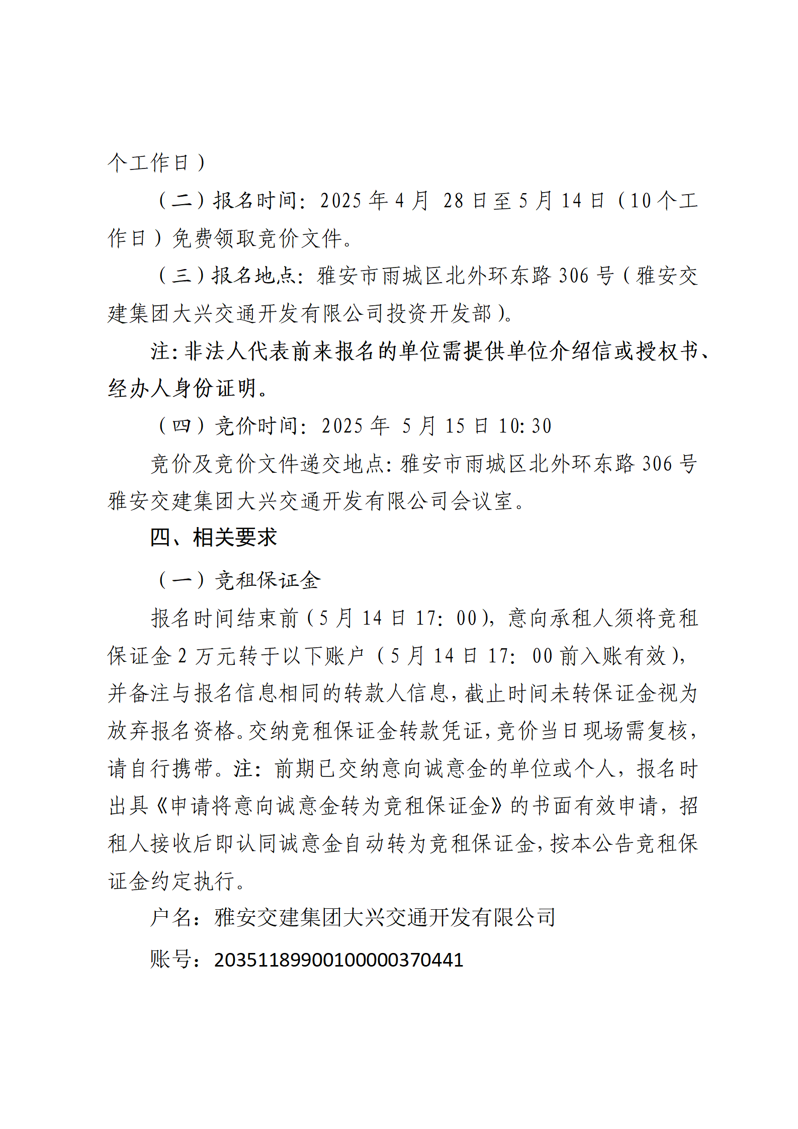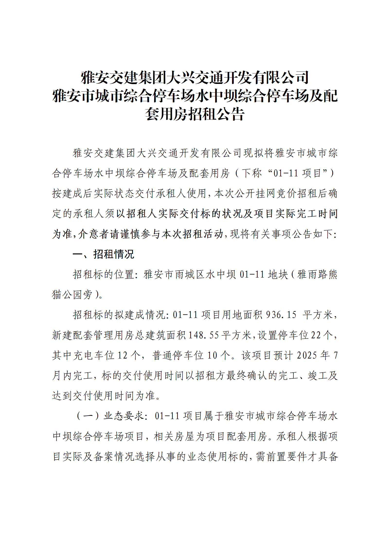 DB视讯 集团大兴交通开发有限公司 雅安市城市综合停车场水中坝综合停车场及配套用房招租公告