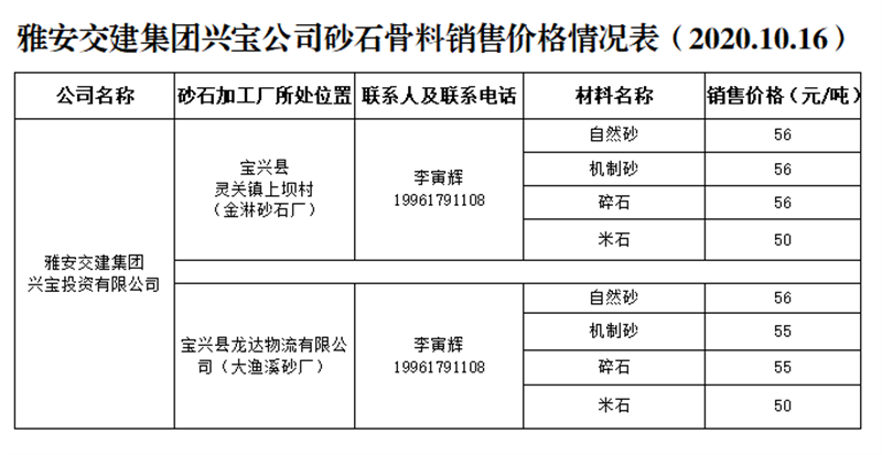 DB视讯 集团兴宝公司砂石骨料销售价格情况表(2020.10.16)