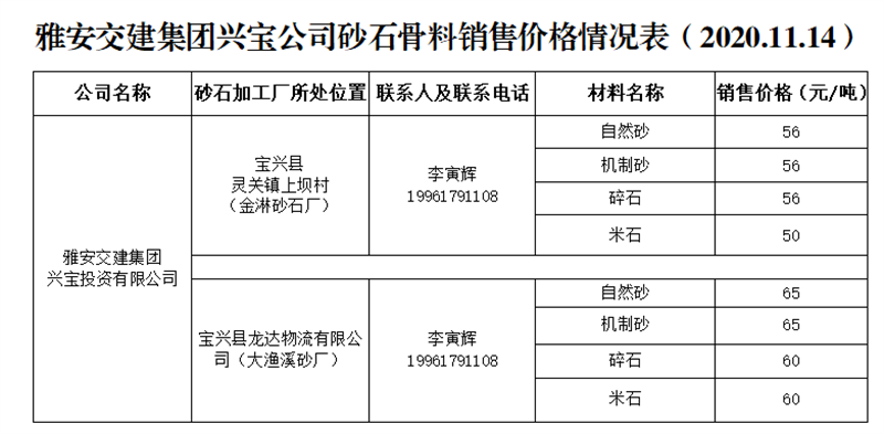 DB视讯 集团兴宝公司砂石骨料销售价格情况表(2020.11.14)