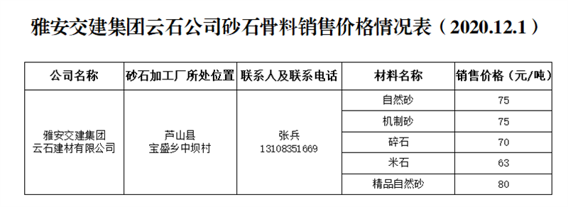 DB视讯 集团云石公司砂石骨料销售价格情况表(2020.12.1)