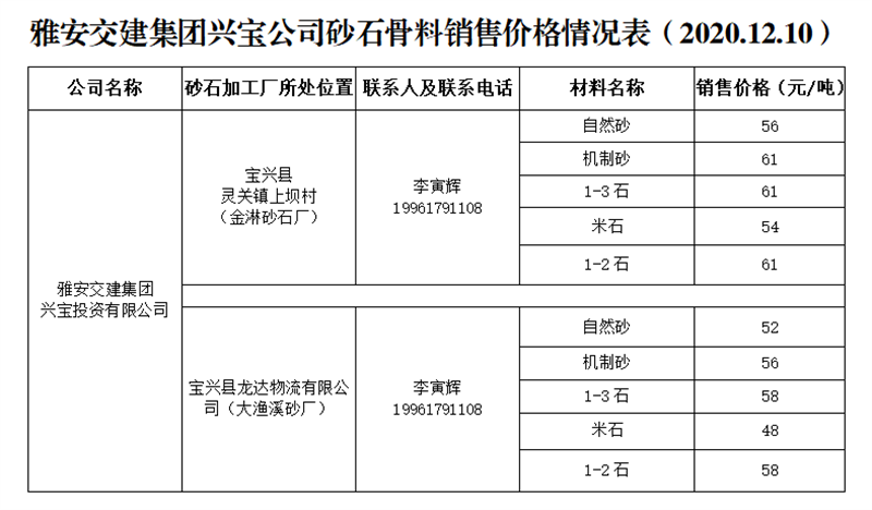 DB视讯 集团兴宝公司砂石骨料销售价格情况表(2020.12.10)