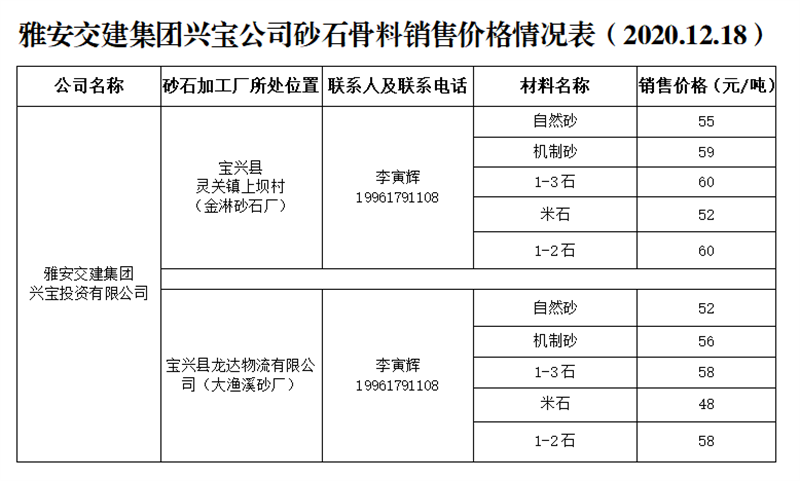 DB视讯 集团兴宝公司砂石骨料销售价格情况表(2020.12.18)
