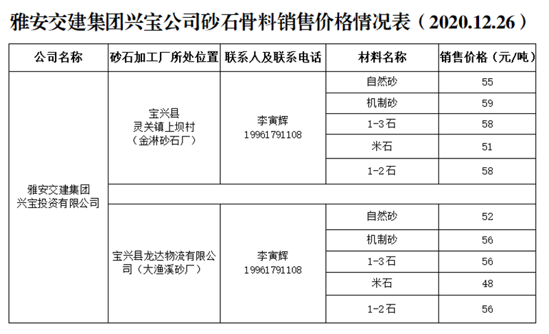 DB视讯 集团兴宝公司砂石骨料销售价格情况表(2020.12.26)