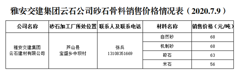 DB视讯 集团云石公司砂石骨料销售价格情况表(2020.7.9)