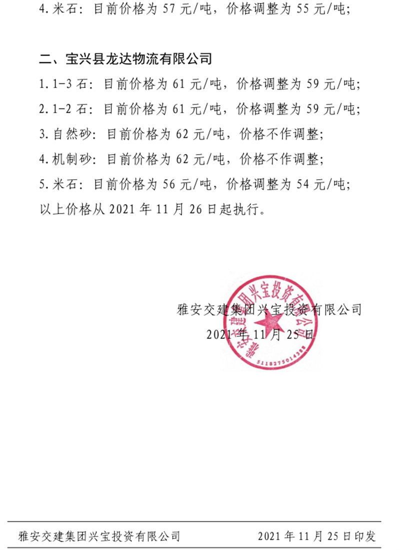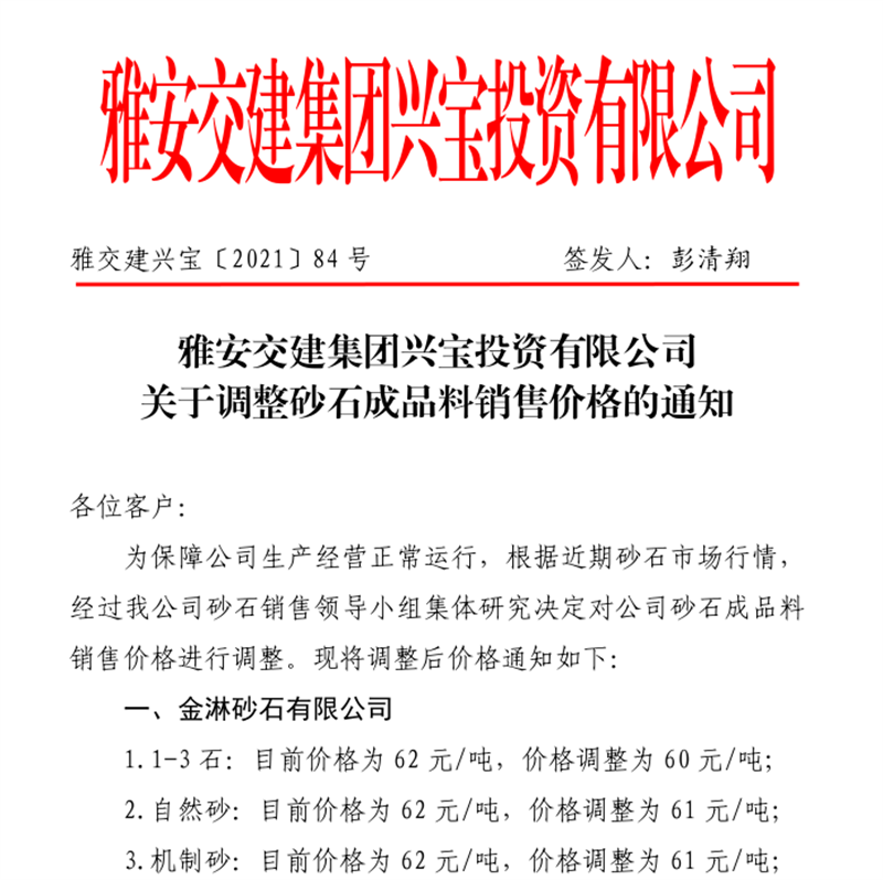 DB视讯 集团丹石公司关于调整砂石成品骨料销售价格的通知(2021.12.9)